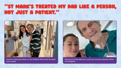 In gratitude to the team that saved her dad’s life, Caroline and her partner, Joe, completed a half marathon and raised an incredible amount to support St Mark’s. Philanthropy like theirs continues to help St Mark’s innovate and maintain excellent care for patients and influence standards of care nationally.